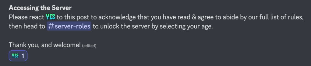 When you click the link above, you’ll be taken to the channel called #rules. Please give them a read and then click that “YES” emoji underneath. Then, click the #server-roles link above it.