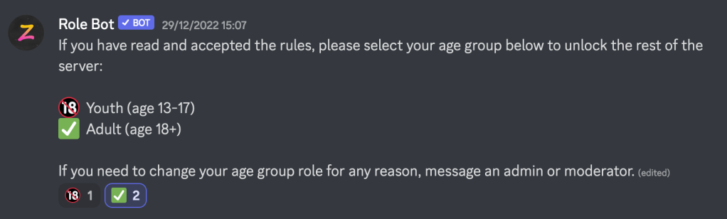 Under the first message, tell us whether you’re underage or not by clicking the relevant emoji, just like before. That will unlock the rest of the server. Feel free to explore! You can also select your pronouns if you like.